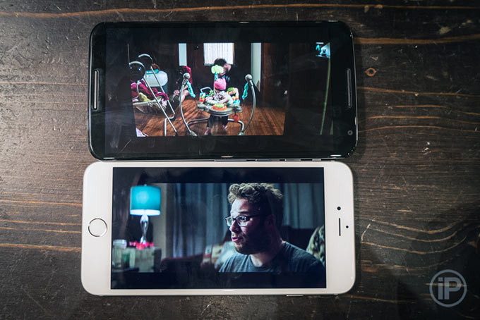 Зато по уровню контрастности и глубине черного цвета дисплей Android-устройства однозначный лидер, чему причиной технология AMOLED — светится каждый пиксель-диод и если нужно сделать черный цвет, то нужные светодиоды просто отключаются. В ЖК же вся матрица подсвечивается с обратной стороны сквозь светорассеиватель, и в полной темноте черный цвет будет выглядеть подсвеченным серым. Да, в дисплее iPhone 6 используются двухдоменные пиксели, что повышает глубину черного и уровень контрастности, но до AMOLED ему все-таки далеко. Да и более яркие и сочные цвета при просмотре видео мне на Nexus 6 нравятся намного больше, в этом плане он победитель в моих глазах: