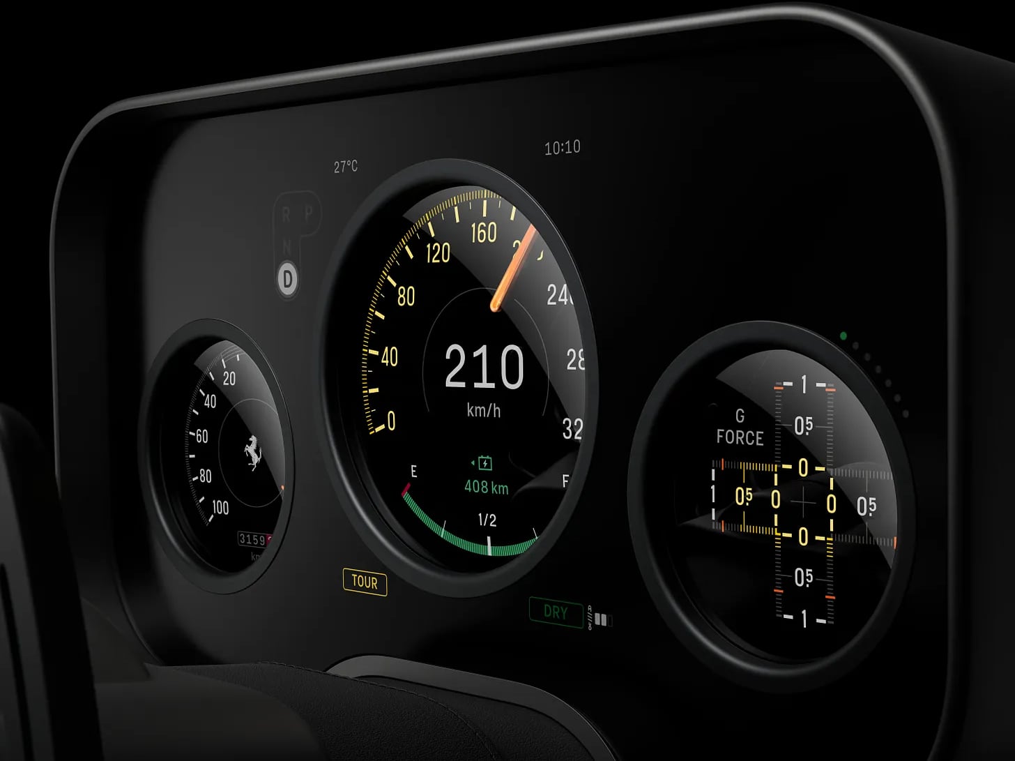 Панель приборов состоит из двух перекрывающихся OLED-дисплеев Samsung. В большом дисплее есть три выреза, которые открывают доступ ко второму экрану. Это первая в мире подобная конструкция, позволяющая вырезать отверстия в OLED-панелях такого масштаба.