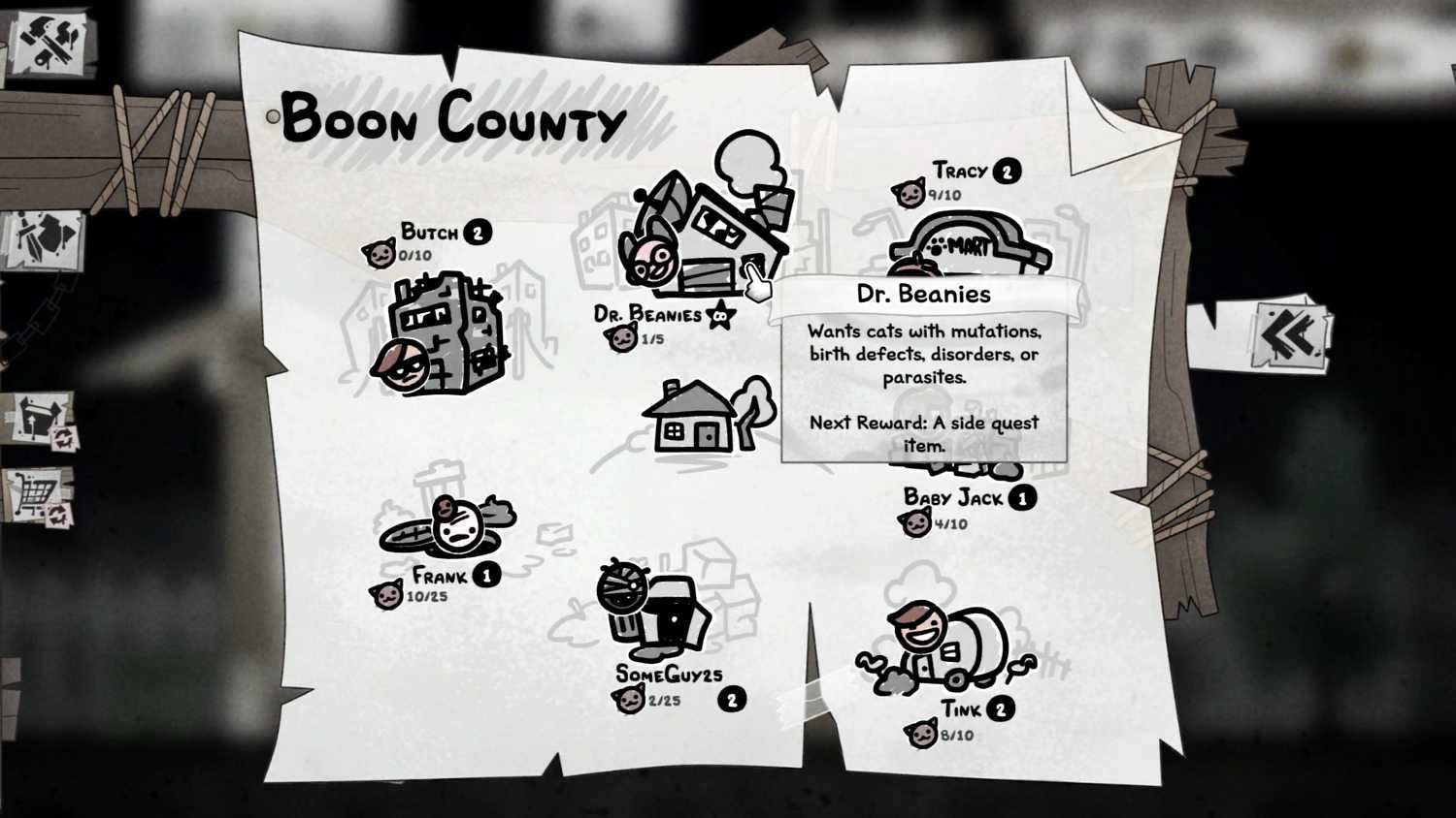 Параллельно коричневой эстетике, Mewgenics переполнена отсылками на поп-культуру в промышленных масштабах. Наверное, самый крутой пример — это главное меню. Во-первых, не пропускайте заставку перед ним, она существует в огромной куче вариантов, а во-вторых, да, кнопка «мяу» ничего не делает, кроме соответствующего звука.