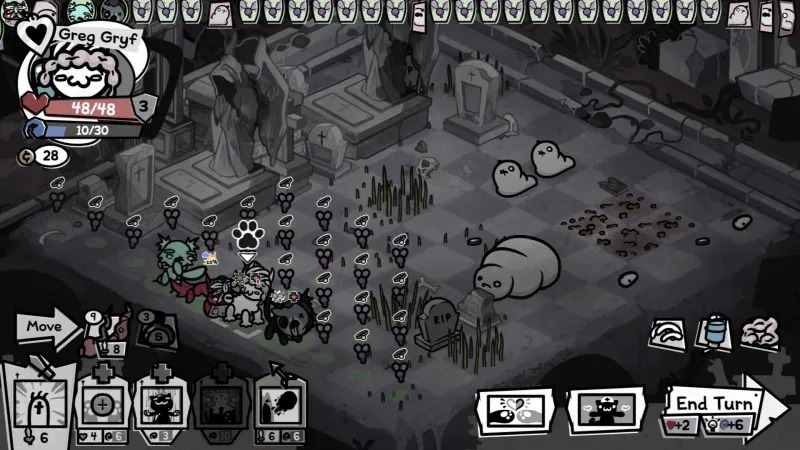 Если у кота заканчивается HP, он получает травму (постоянное снижение характеристики или дебафф) и теряет сознание. Если его не трогать, он очнется к концу боя. Но есть враги, которые могут убивать даже полностью здоровое животное с одного хода и наглухо. Вот эти кото-акулы, например, наводят панику даже спустя 30 часов.