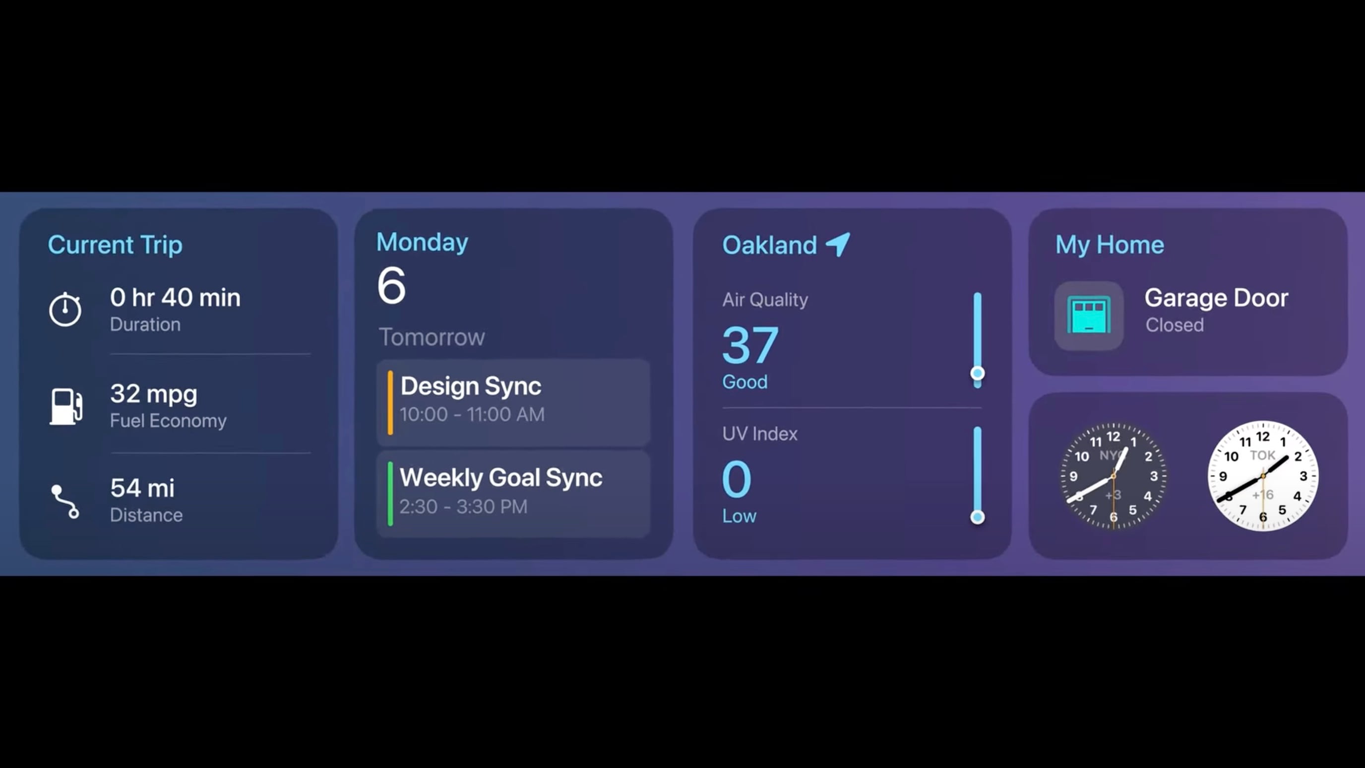 Apple сделала большой акцент на виджетах в CarPlay, которые на демонстрационных изображениях занимают большую часть в автомобиле. Тут и календарь с ближайшими встречами, и предложения с заправками от Apple Maps, и обновленный музыкальный плеер, и управление воротами через HomeKit.