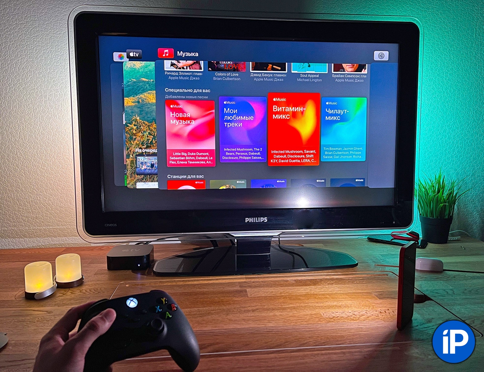 Или просто открою Apple Music со всей медиатекой и красивым, стильным режимом караоке. Могу на большом экране показать видео и фото, буквально минуту назад снятые на другие девайсы Apple.