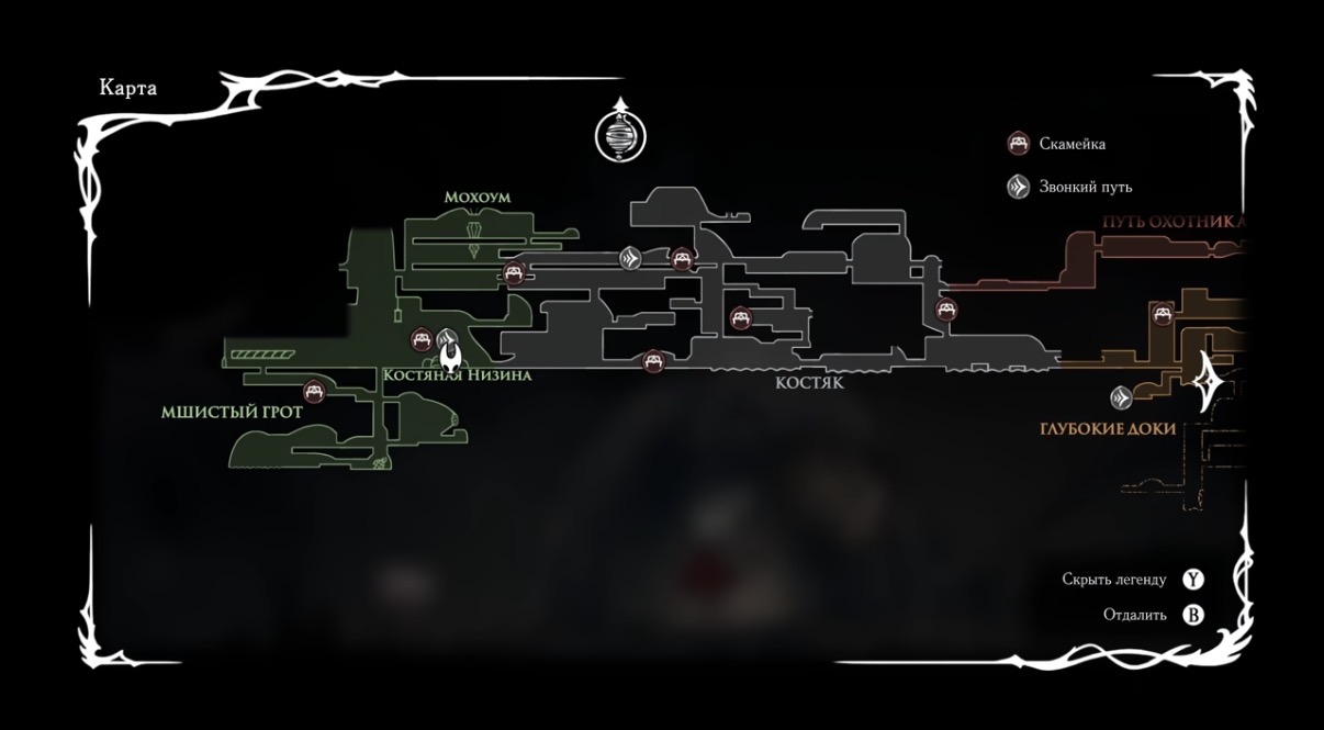 Фарлум — это «вертикальная» страна, где дорога буквально ведёт наверх. Стартуешь внизу и ползешь к сияющему цитадельному пику. По пути нас встречают мшистые гроты на старте, затем индустриальные доки и более нарядные биомы. По ощущениям та же связная метроидвания, но сделанная под более акробатичную Хорнет.