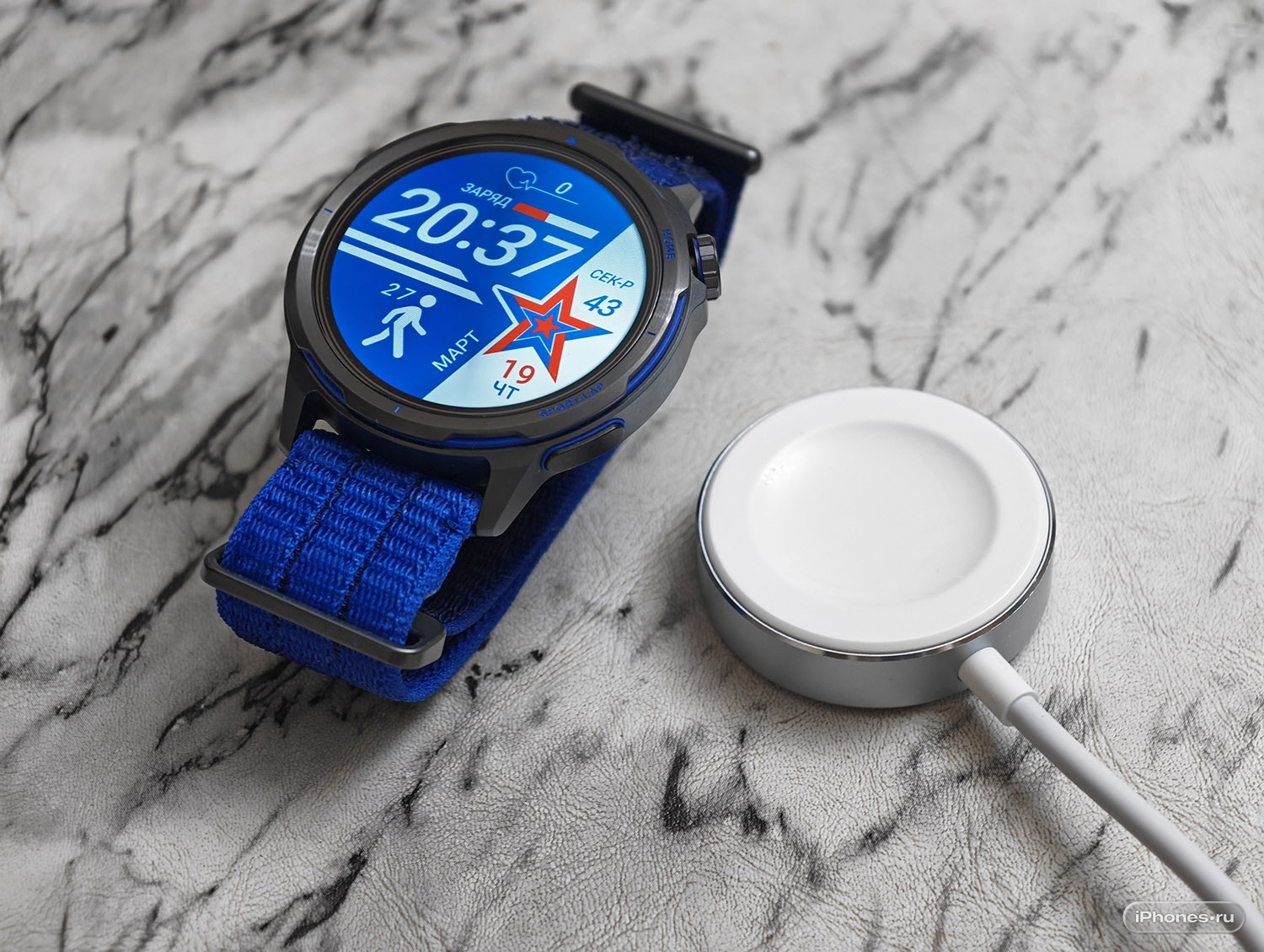 Магнитная зарядная шайба душевного такого размера с встроенным кабелем USB-C соседствует с дополнительным ремешком.
