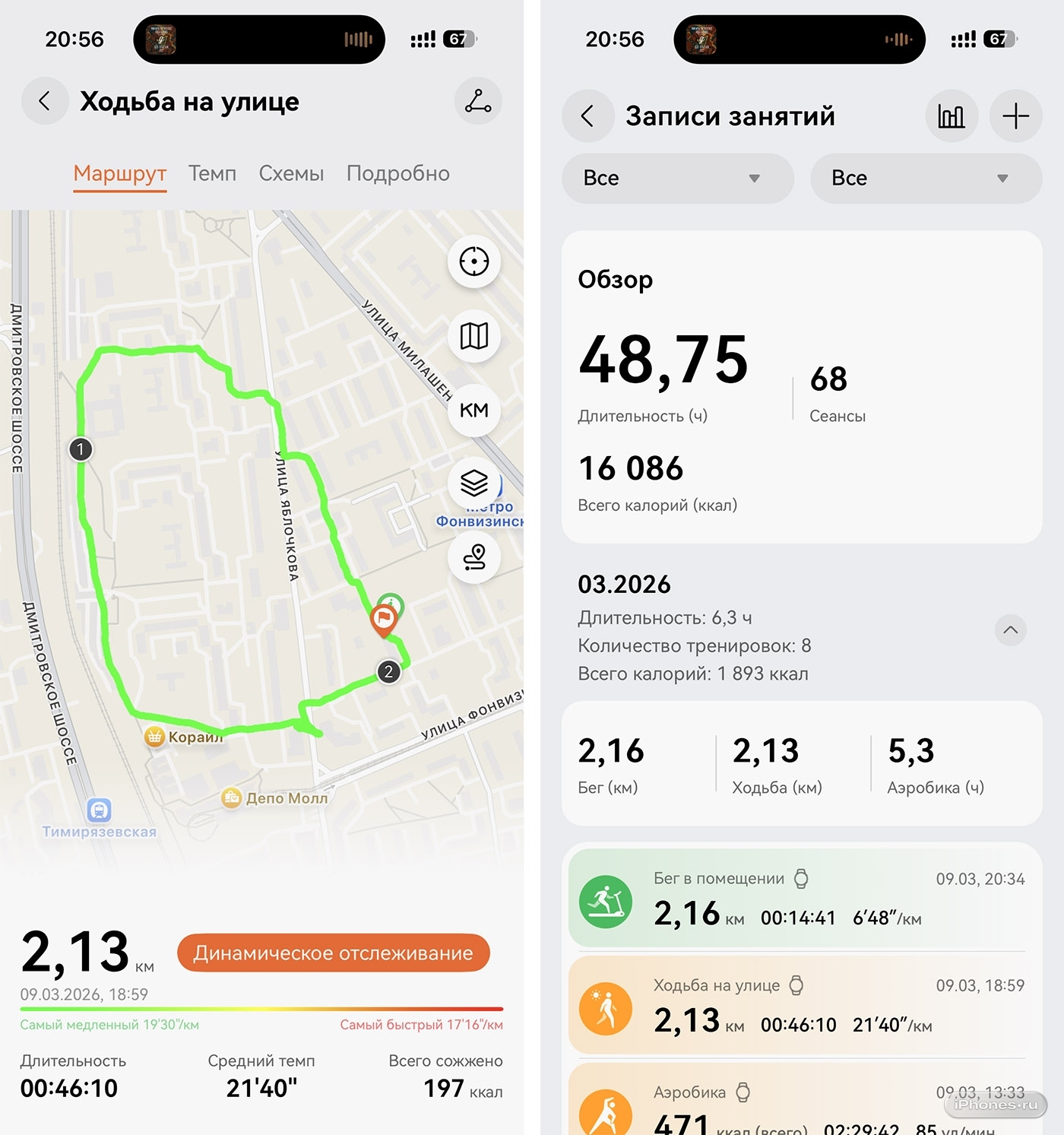 Во время пробежек по городу мы сравнили трек со смартфоном в кармане. Часы нарисовали идеально ровную линию по тротуару, в то время как телефон периодически «закидывал» на крыши домов, проезжую часть и в Шереметьево, куда ж без этого.