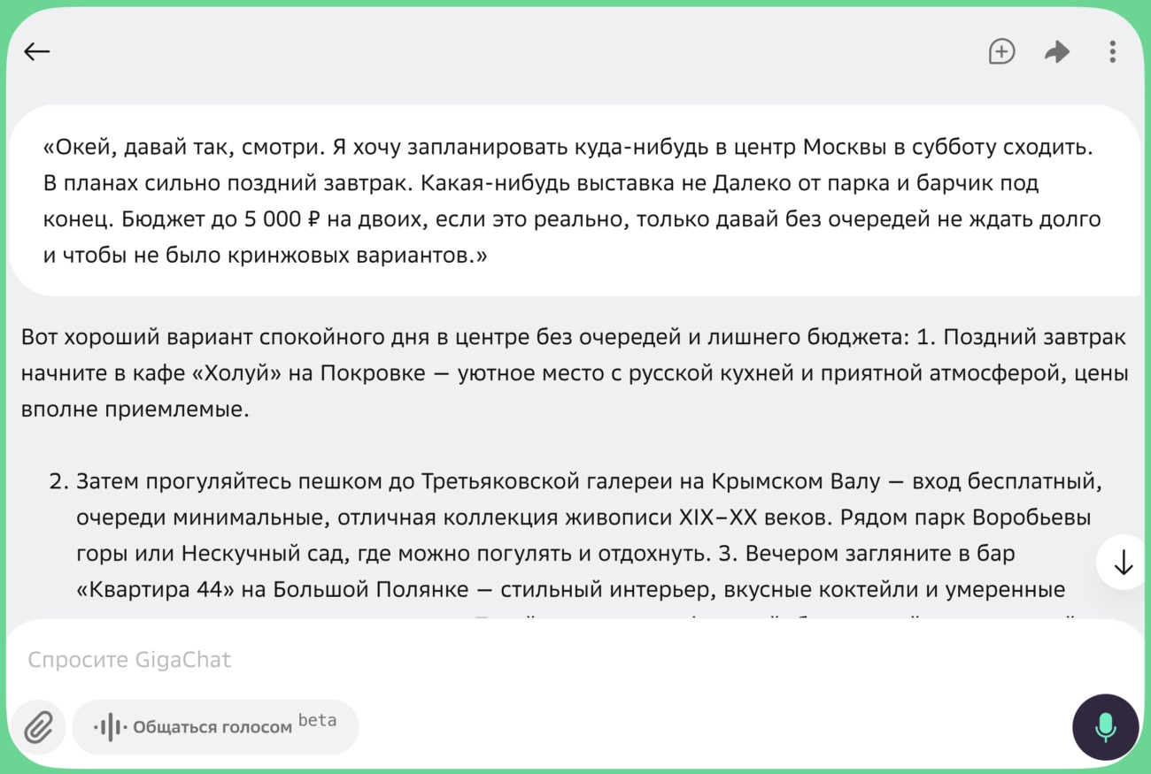 📍Промпт: Я хочу запланировать куда-нибудь в центр Москвы в субботу сходить. В планах сильно поздний завтрак. Какая-нибудь выставка недалеко от парка и барчик под конец. Бюджет до 5 000 ₽ на двоих, если это реально, только давай без очередей не ждать долго и чтобы не было кринжовых вариантов.»