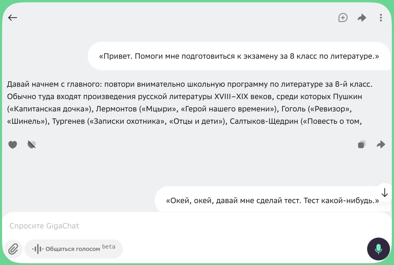 Также радовало, что на правильном ответе ГигаЧат дружелюбным тоном хвалил и не отвлекался от основной задачи, даже если я делал простые человеческие комментарии по содержанию произведений, не связанные с тестированием.
