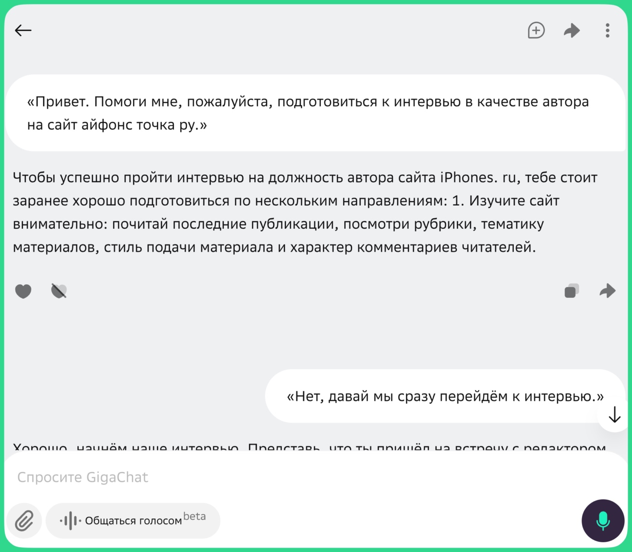 📍Промпт: «Привет. Помоги мне, пожалуйста, подготовиться к интервью в качестве автора на сайт iPhones.ru»