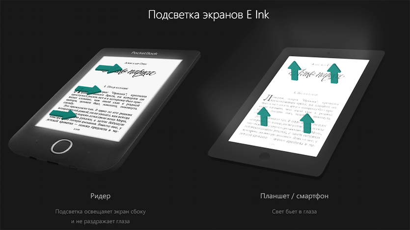 И даже «базовая», обычная белая подсветка ридера, — она безопаснее, чем вроде бы такая же с виду белая подсветка LCD-экрана смартфона. Плюс сама подсветка у покетбука реализована не как у смартфона («в лицо читателю»), а распределяется равномерно по периметру экрана и освещает только текст.
