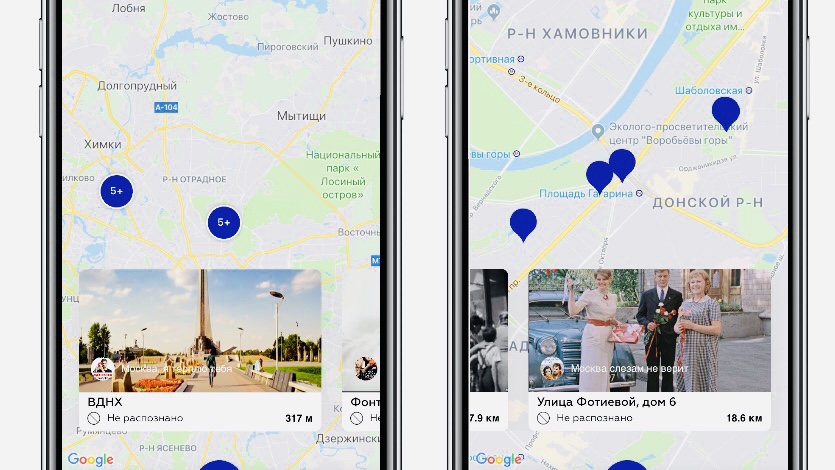 На первой вкладке приложения разместилась карта Москвы с отметками достопримечательностей. Вы можете поискать ближайшие к вам локации, адрес прописан прямо на карточке с кадром.