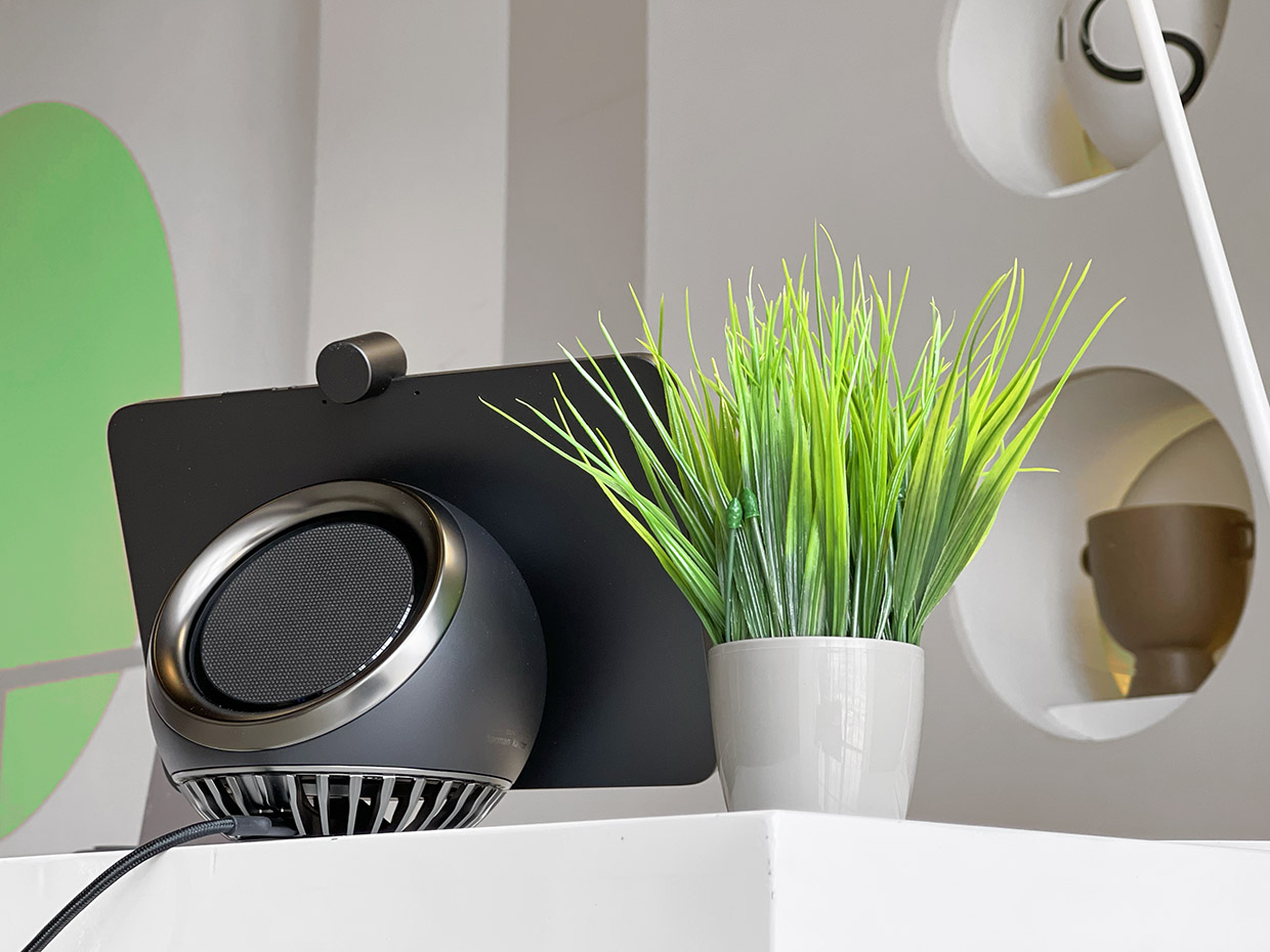 Благодаря грамотному дизайнерскому решению создаётся впечатление, будто экран парит в воздухе, а не стоит на динамике. Последний вообще не видно за экраном. При этом он слегка приподнят, что упрощает взаимодействие с устройством, да и в него просто банально удобно смотреть под углом.