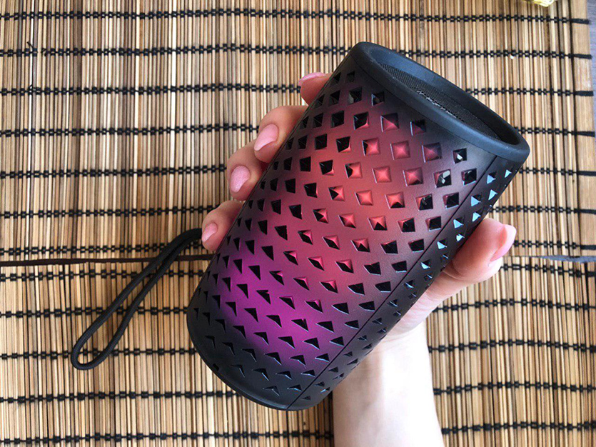 Когда колонка включается, черный строгий бочонок оживает и начинает переливаться всеми цветами радуги. Выглядит это очень круто, так как матовый корпус колонки состоит из множества пирамидальных углублений, отчего проникающий через них свет просто завораживает.