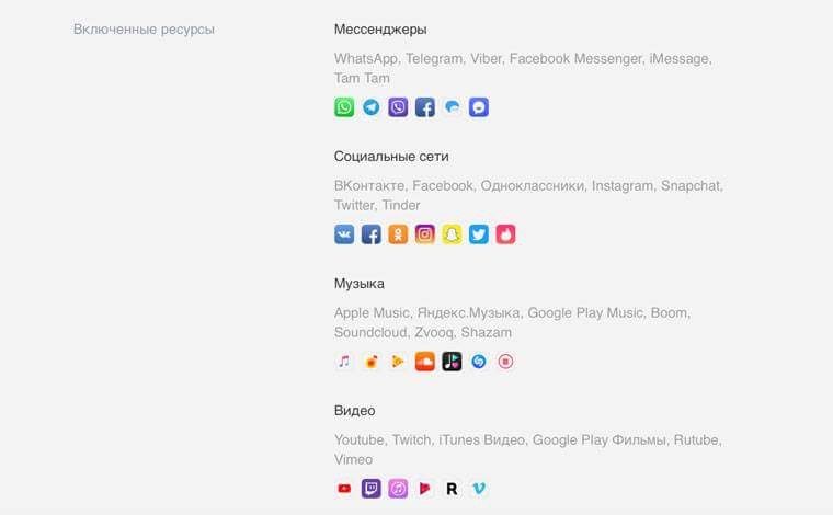 Ниже представлен список сервисов, трафик на использование которых не учитывается: