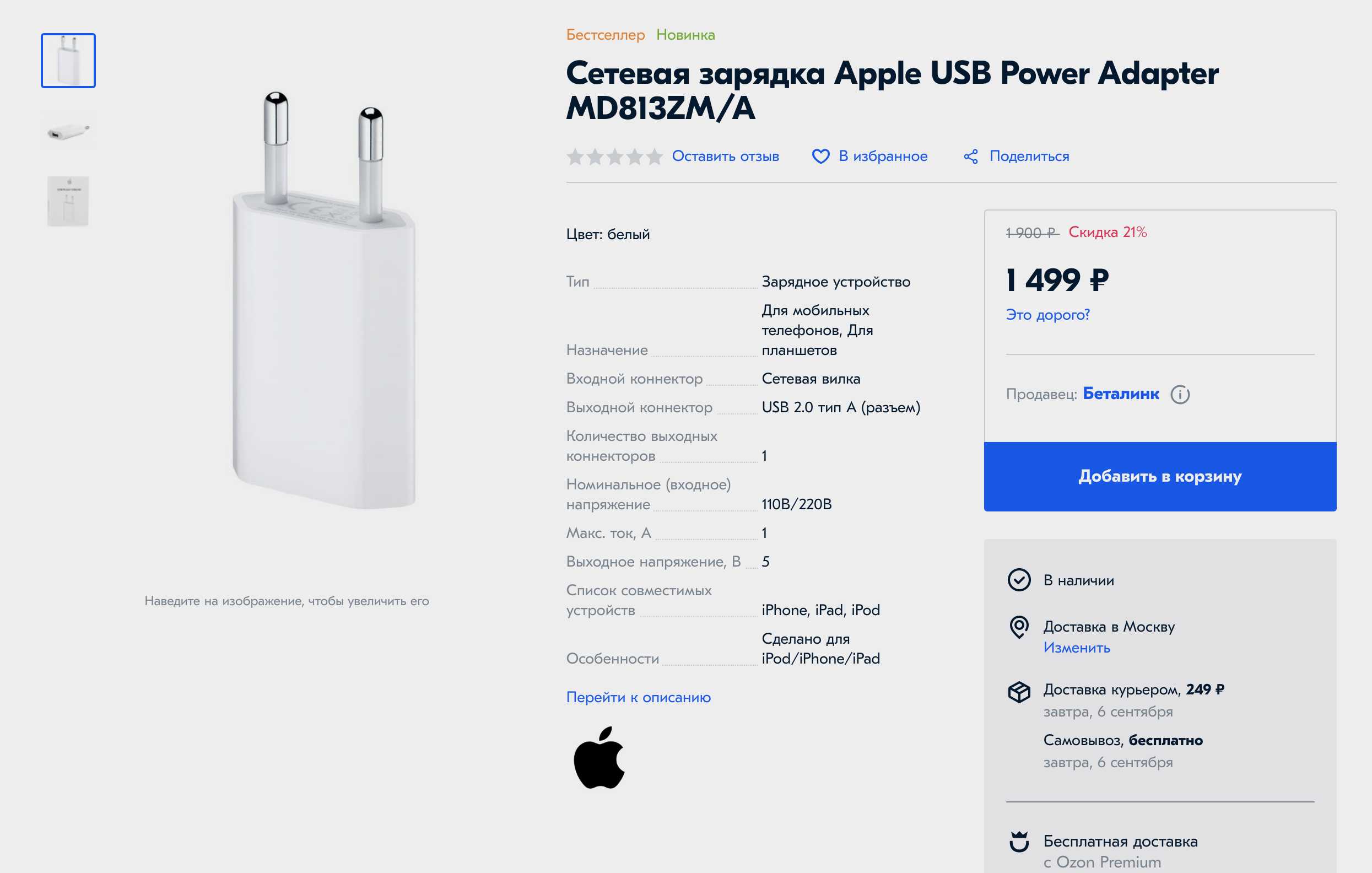 Это уже скорее бонус, просто для вашей информации. Ввожу в поиск зарядное устройство для iPhone, вижу в результатах вроде бы оригинальный блок на 5 Ватт.