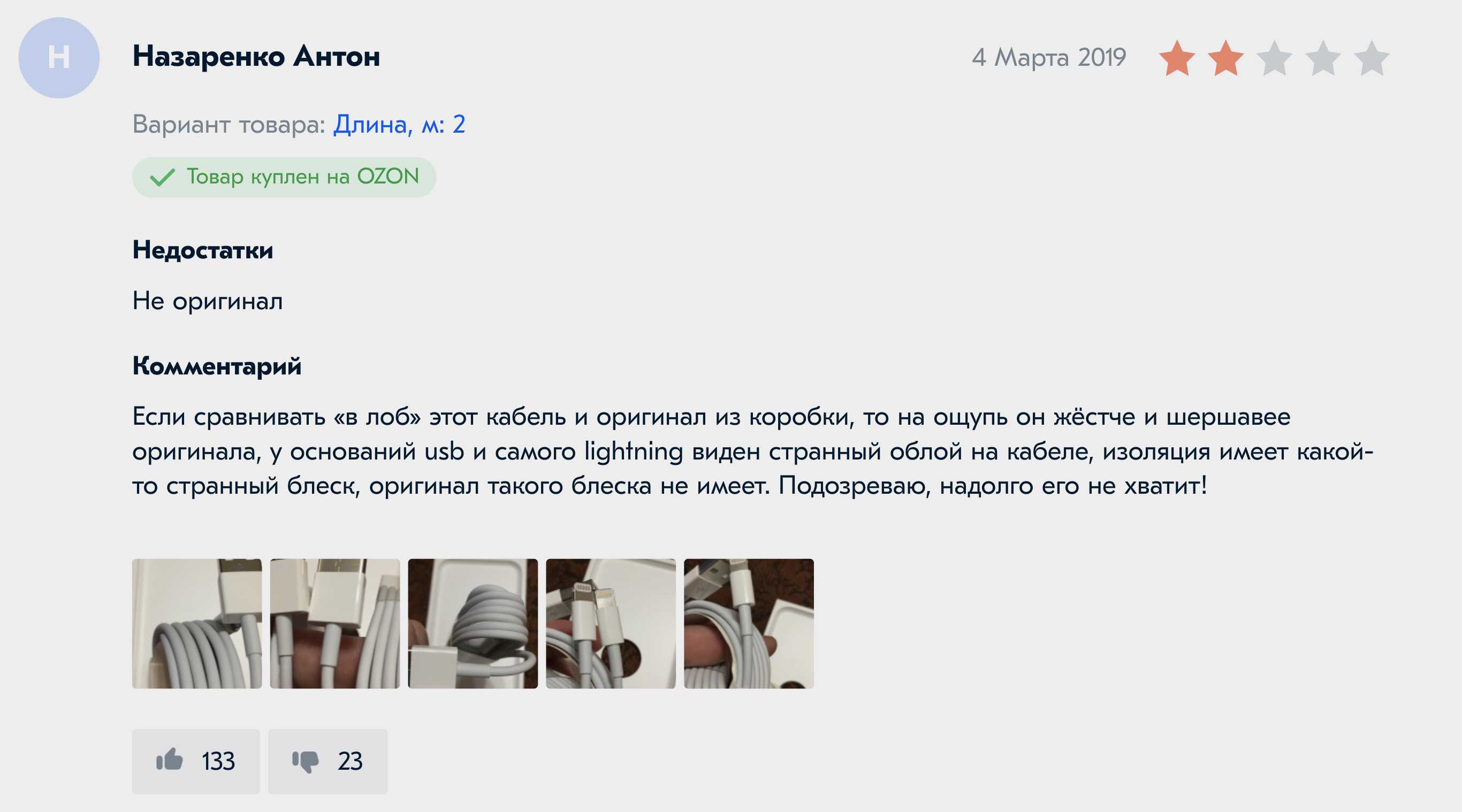 То есть продаёт эти кабели именно OZON? Получается, в отзывах фактически пишут: OZON торгует подделками Apple. Я бы на месте Озона пошёл разбираться в ситуации, выглядит она нехорошо.