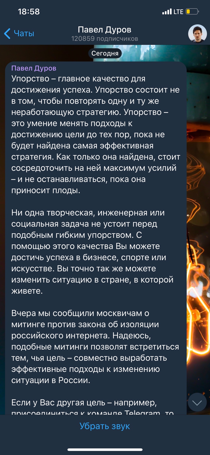 В нем он посоветовал не сдаваться и не мириться с «ситуацией в России». А также всегда быть упорными. Ну и заодно призвал на митинг против изоляции рунета.