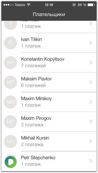 Меню «Плательщики» позволяет осуществлять контроль за конкретными покупателями. Функциональность схожа с веб-версией: можно посмотреть на последние действия клиентов, внести или скопировать необходимые данные из их профиля, выписать новый счёт и так далее. Отсюда же можно плавно перейти в историю операций, где отмечены все важные данные – номер карты, статус, хронология, география.