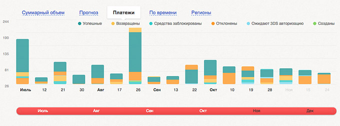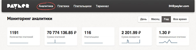 Домашняя страница сервиса – это аналитика. Мощный модуль анализа и статистики, лежащий в ядре Payler, чётко показывает, сколько денег пришло в компанию за любой период времени. А ещё формирует из этого интерактивный график и даже даёт прогноз на следующий год, исходя из имеющихся данных. Сортировать выдачу можно по ряду специфических параметров: например, по времени (в какой момент к вам приходит большая часть заказов), по результату (отклонено, возвращено, прошло успешно и т.д.) и даже по регионам, из которых приходит заявка (помогает оценить реальную эффективность кампаний продвижения бренда/товара). А ещё сервис сам формирует отчёт, который можно скачать в Excel-формате.