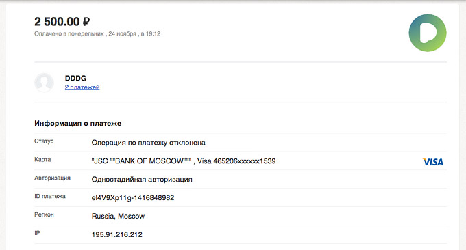 К каждому платежу в Payler привязывается идентификатор клиента, присваивается отдельная страница, а информация подается в предельно понятном и логичном виде. Наша спорная транзакция принадлежит некоему DDG (явно тестовый аккаунт), который ранее совершал ещё одну покупку. Доступны имя банка, сокращённый номер карты, тип авторизации, уникальный идентификационный номер, регион и IP-адрес. Также расписана история, позволяющая понять, на каком этапе случился форс-мажор. В данном случае платёж был зарегистрирован в шлюзе, но отклонён в тот же день – вероятно, из-за отказа банка по причине недостатка средств.