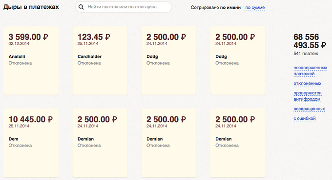 Все спорные ситуации, связанные с оборотом денег, показаны здесь же, на главной странице. «Дыры в платежах» – это подборка отклоненных заявок, средств, зависших при проверке антифродом, возвращенных или ошибочных транзакций. Эдакий кризисный центр, позволяющий моментально реагировать на сложные ситуации.