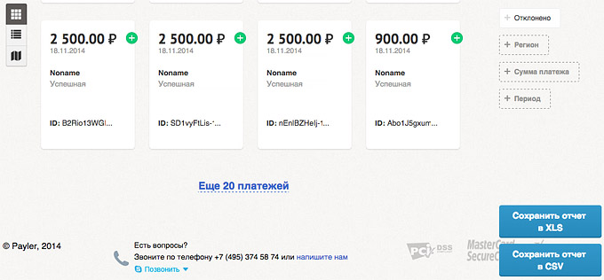 Вторая вкладка в общем меню Payler – это Платежи, база данных всех транзакций с подборкой фильтров. Представление можно изменить, заменив наглядную сетку на традиционный список-таблицу. Список можно просто прокручивать, но проще будет найти нужный пункт через окно поиска вверху. В боковом меню есть несколько фильтров, позволяющие сократить время на обнаружение нужной записи – или же помочь сделать подборку «особенных» транзакций для детального изучения.