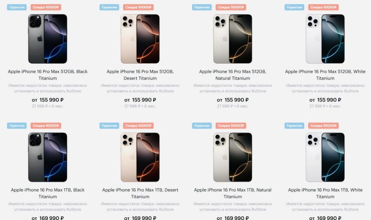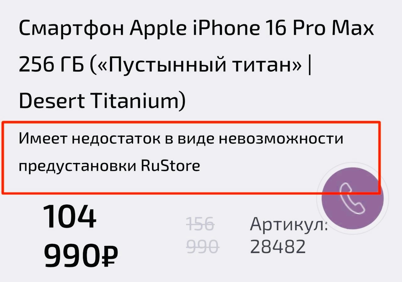 С 1 сентября 2025 года российские онлайн-магазины и ритейлеры начали помечать iPhone и iPad дополнительной плашкой, вроде такой: «Имеется недостаток – невозможность предустановить RuStore».