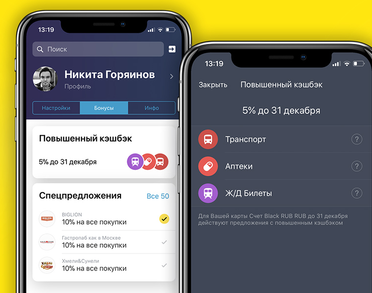 Отдельное меню сделано под скидки и программу повышенного кэшбека. Раз в 3 месяца, как подобает владельцу карты Tinkoff Black, я прямо в приложении выбираю 3 из 5 предложенных категорий 5%-тного возврата денег. Для каждой из категорий есть описание конкретных трат, туда попадающих, так что непоняток ещё не было.
