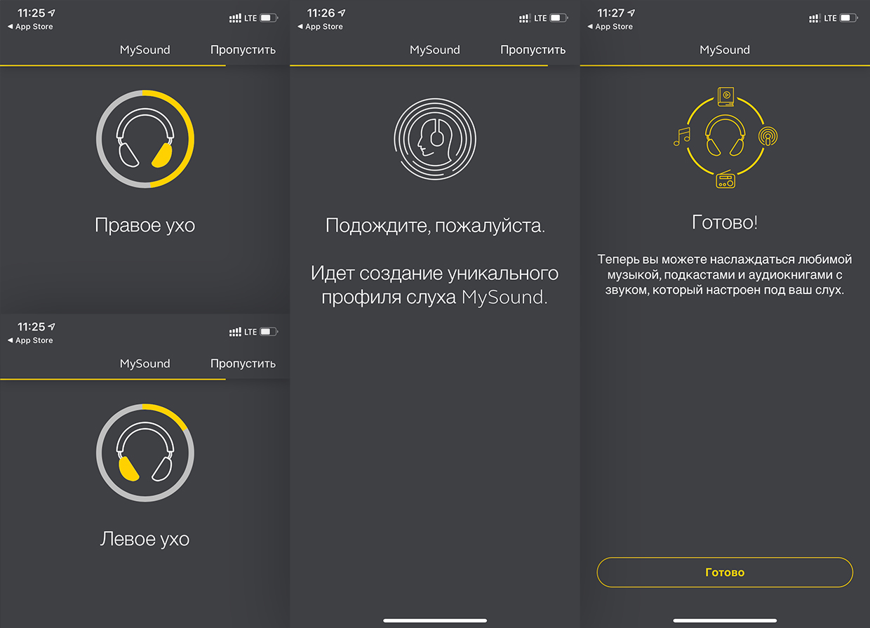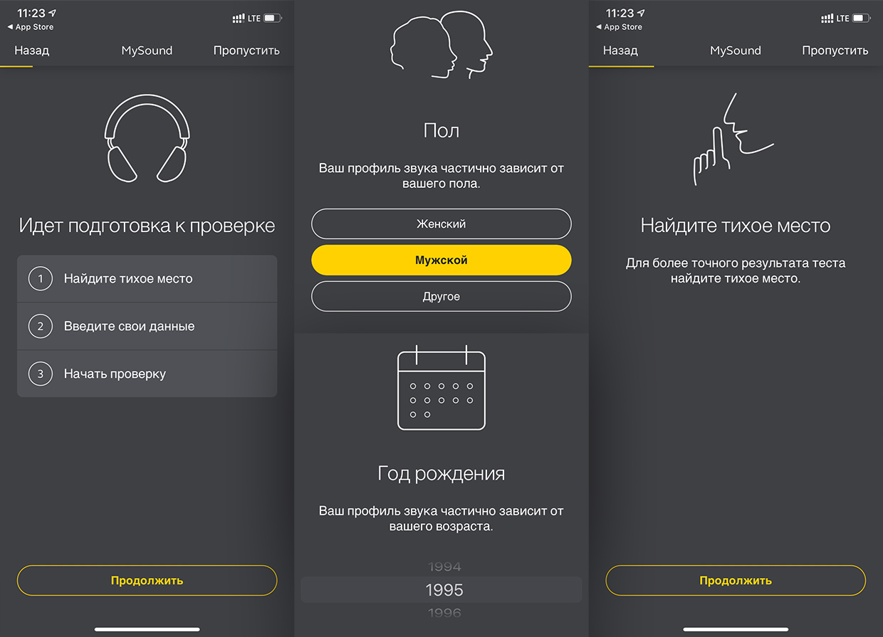 После соединения вам предложат индивидуально скорректировать звучание. Вас попросят найти тихое место и нажимать на экран, когда сначала в правом, а затем в левом наушнике услышите тихие звуки разного тона и громкости.