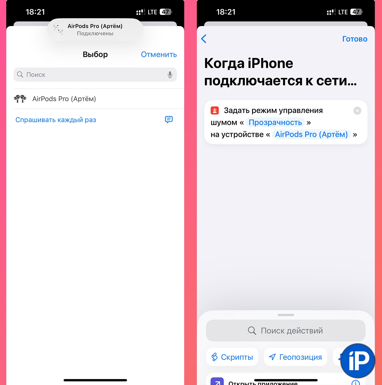 5. В действии укажите вашу гарнитуру, в момент настройки автоматизации ее нужно надеть. И выберите нужный режим шумоподавления.
