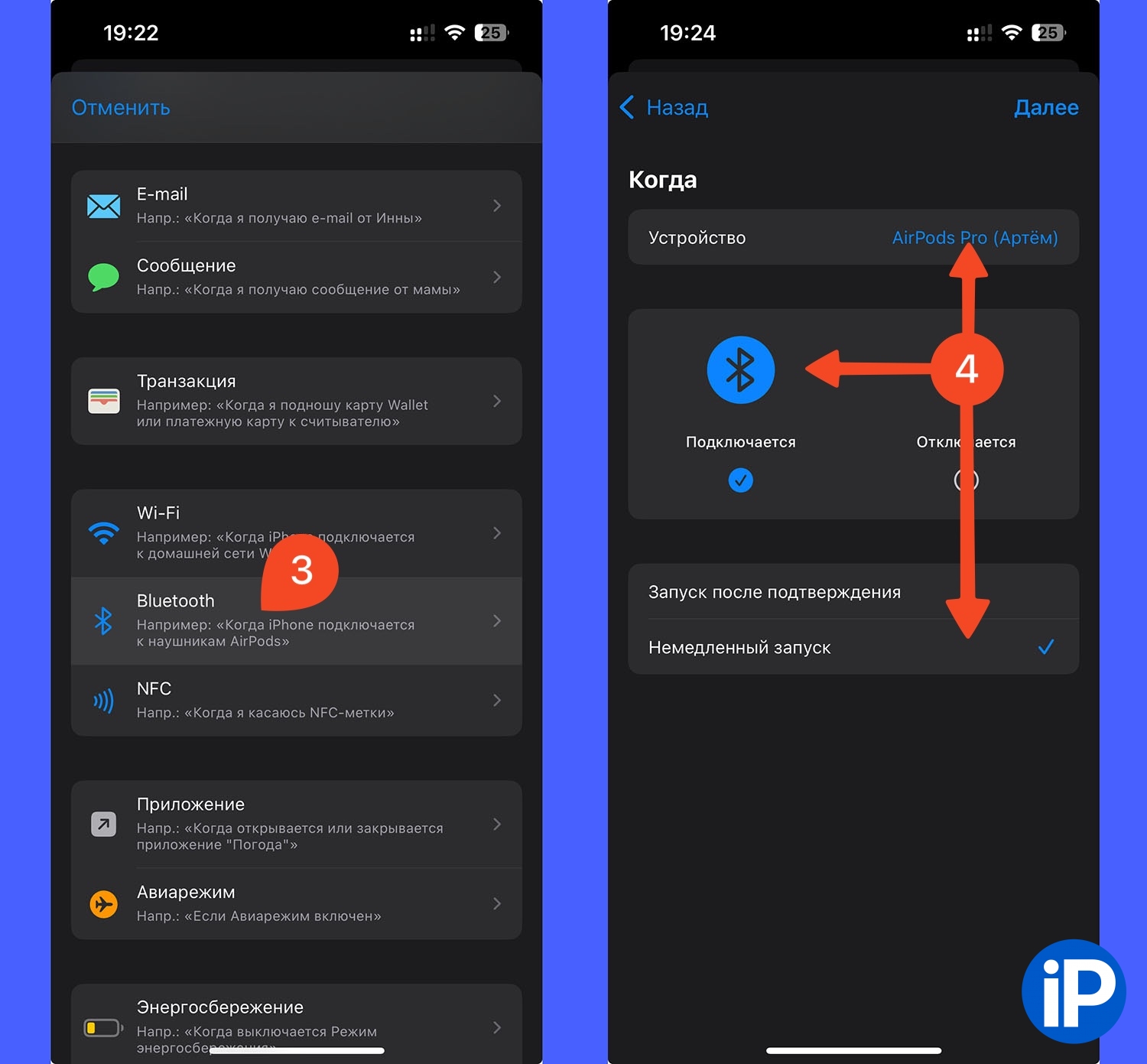 4. На следующем шаге укажите устройство, при подключении к которому будет срабатывать автоматизация, включите опции Подключается и Немедленный запуск.