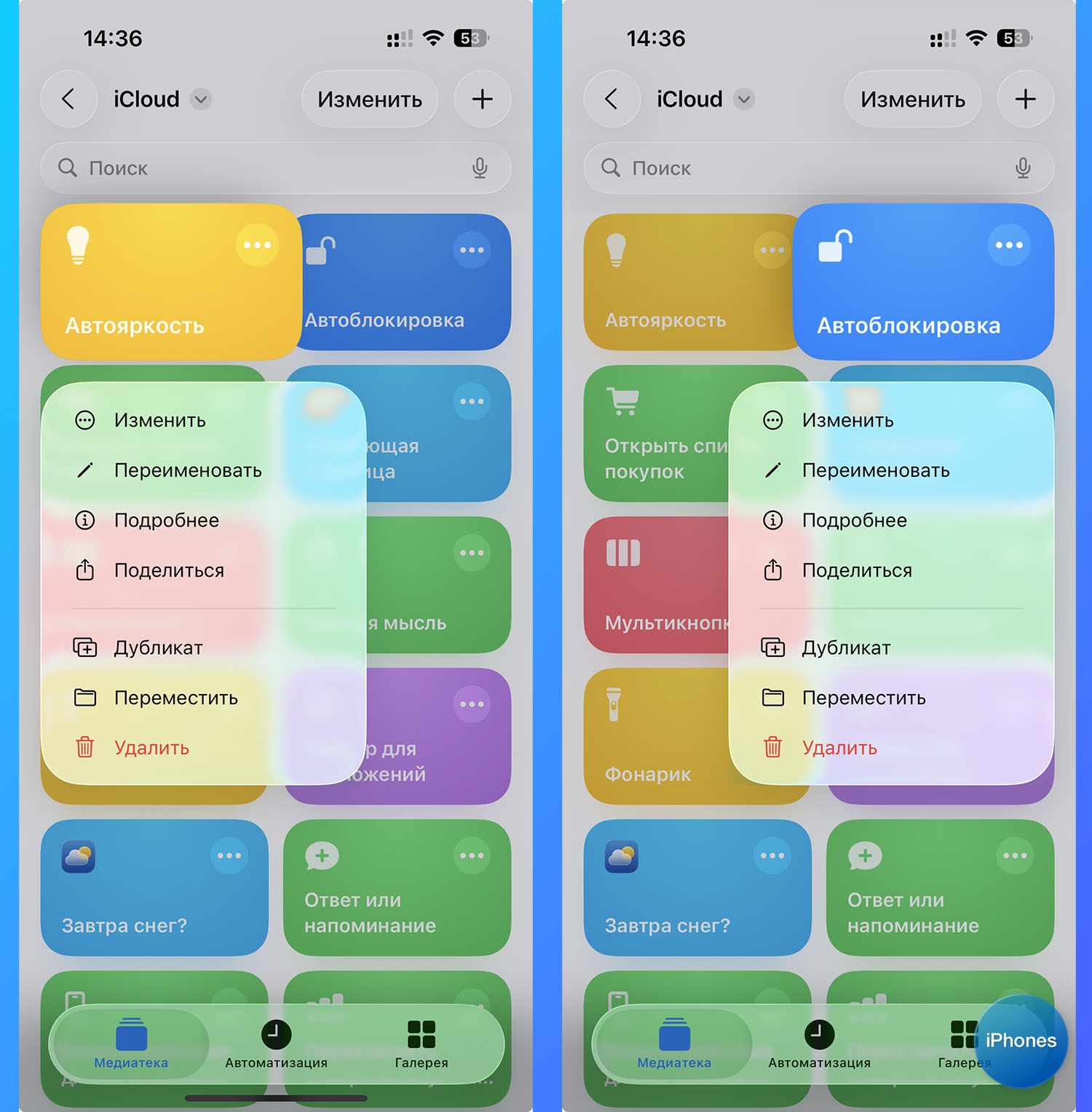 К сожалению, менять эти параметры одним тапом в пункте управления или командой не получится, но есть обходной путь. Быстрая команда может сразу открывать нужный раздел настроек и через несколько секунд возвращать вас в исходное приложение. Сейчас расскажу, как настроить.