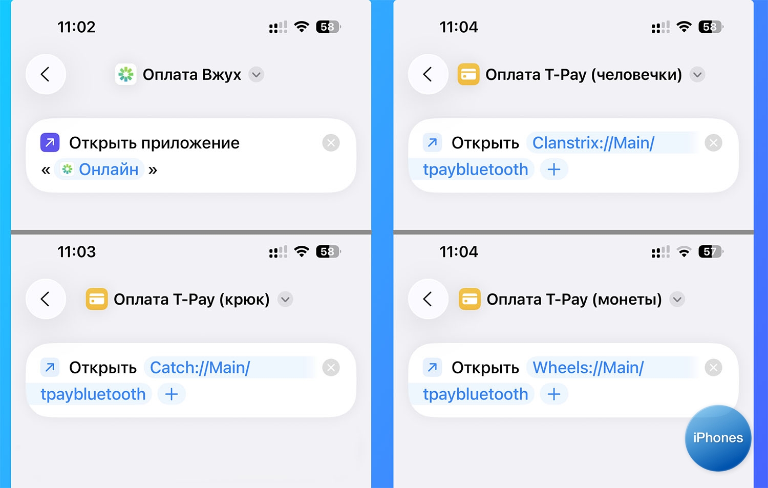 🟡 Для приложения Т-Банка – Clanstrix (иконка с человечками) добавьте действие Открыть URL и вставьте ссылку: Clanstrix://Main/tpaybluetooth