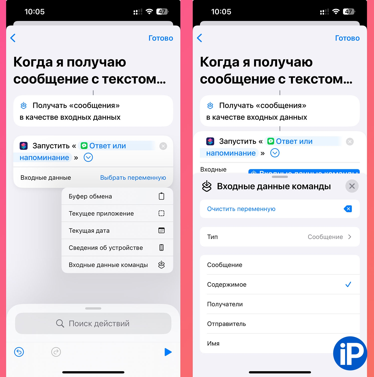 7. Раскройте параметры действия, нажмите на кнопку Выбрать переменную и укажите Входные данные команды. Потом еще раз тапните на Входные данные команды и выберите Содержимое.