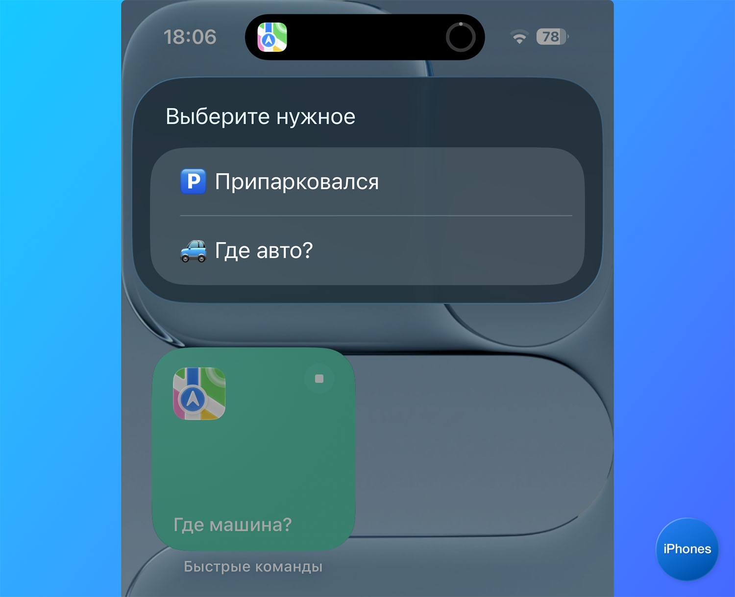 Теперь, когда нужно сохранить место парковки, запустите команду и выберите Припарковался. Команда сохранит геопозицию и добавит метку на карте.