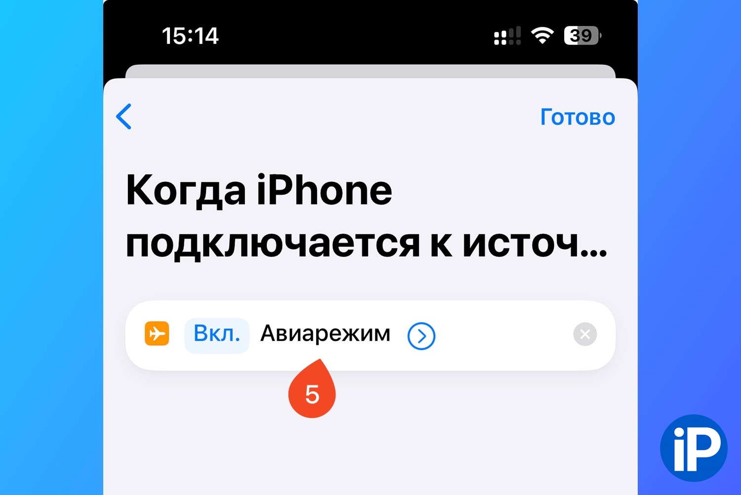 5. На следующем шаге добавьте действие Включить авиарежим. Получите стандартную автоматизацию, которая будет срабатывать при каждом подключении к зарядке.