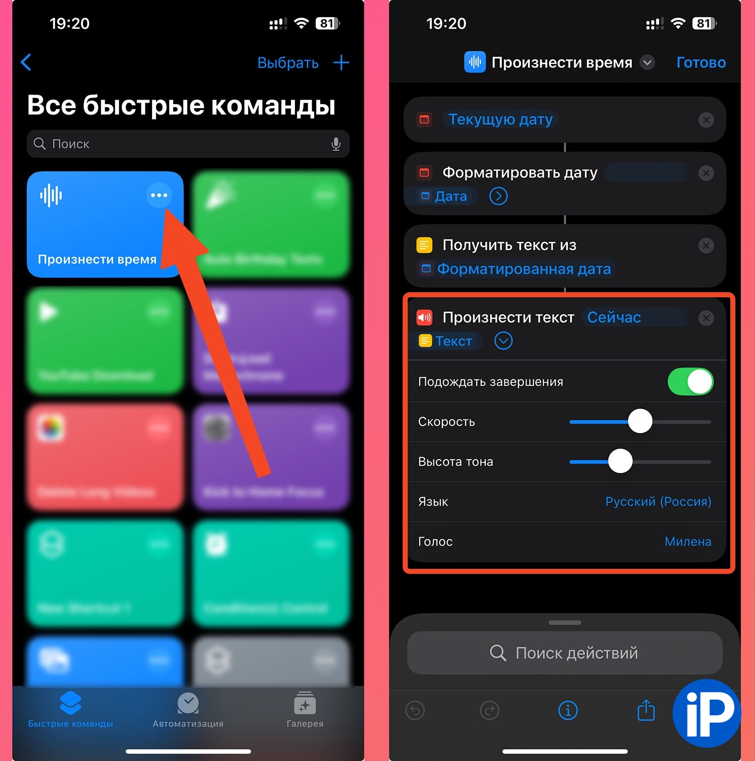 6. Выберите действие – Запустить быструю команду и укажите загруженный скрипт Произнести время.