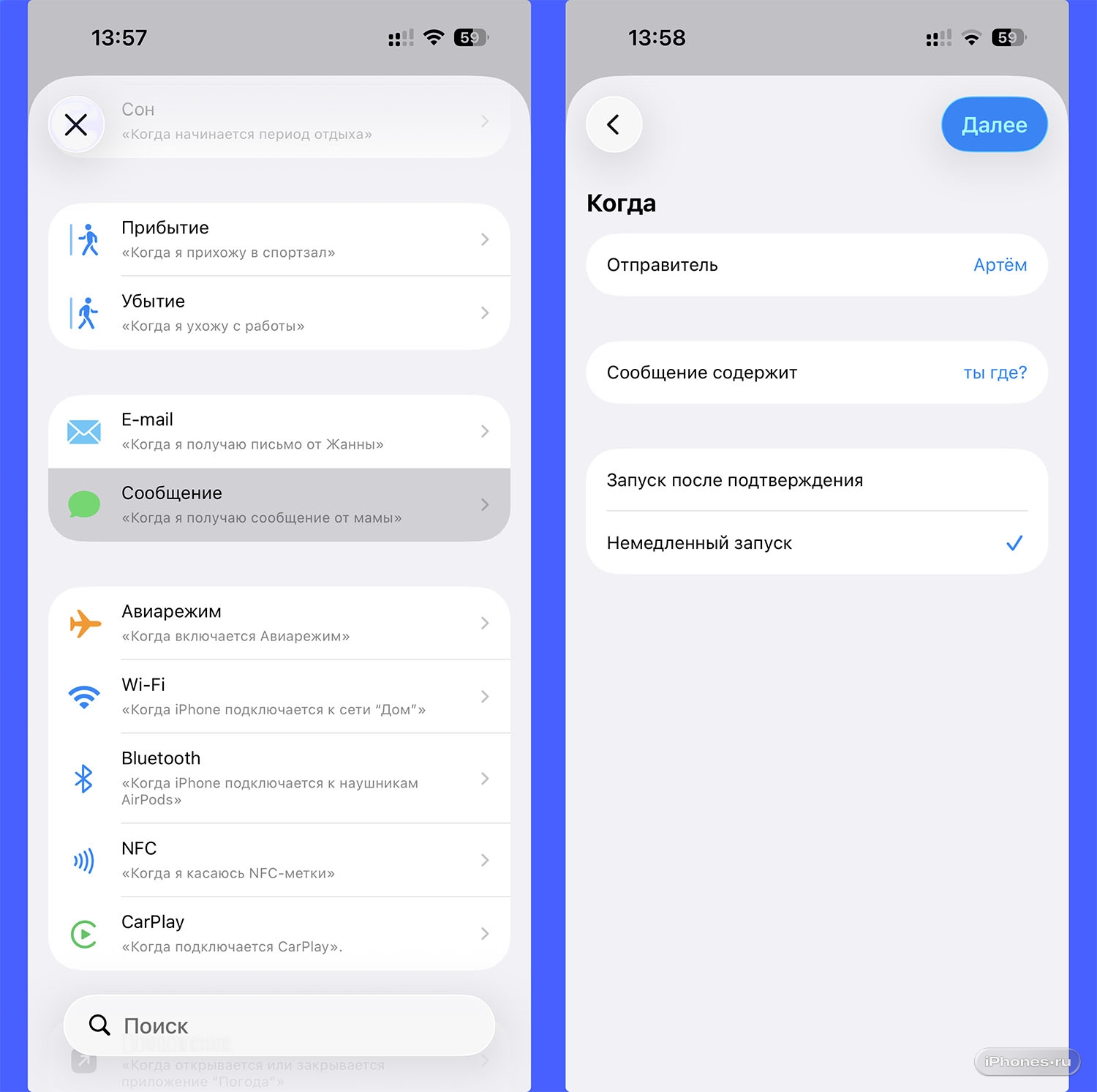 По умолчанию, сообщение будет отправлено через iMessage, можно заменить сервис на другой удобный мессенджер. Для этого добавьте новую команду Отправить сообщение и выберите нужный мессенджер и получателя.