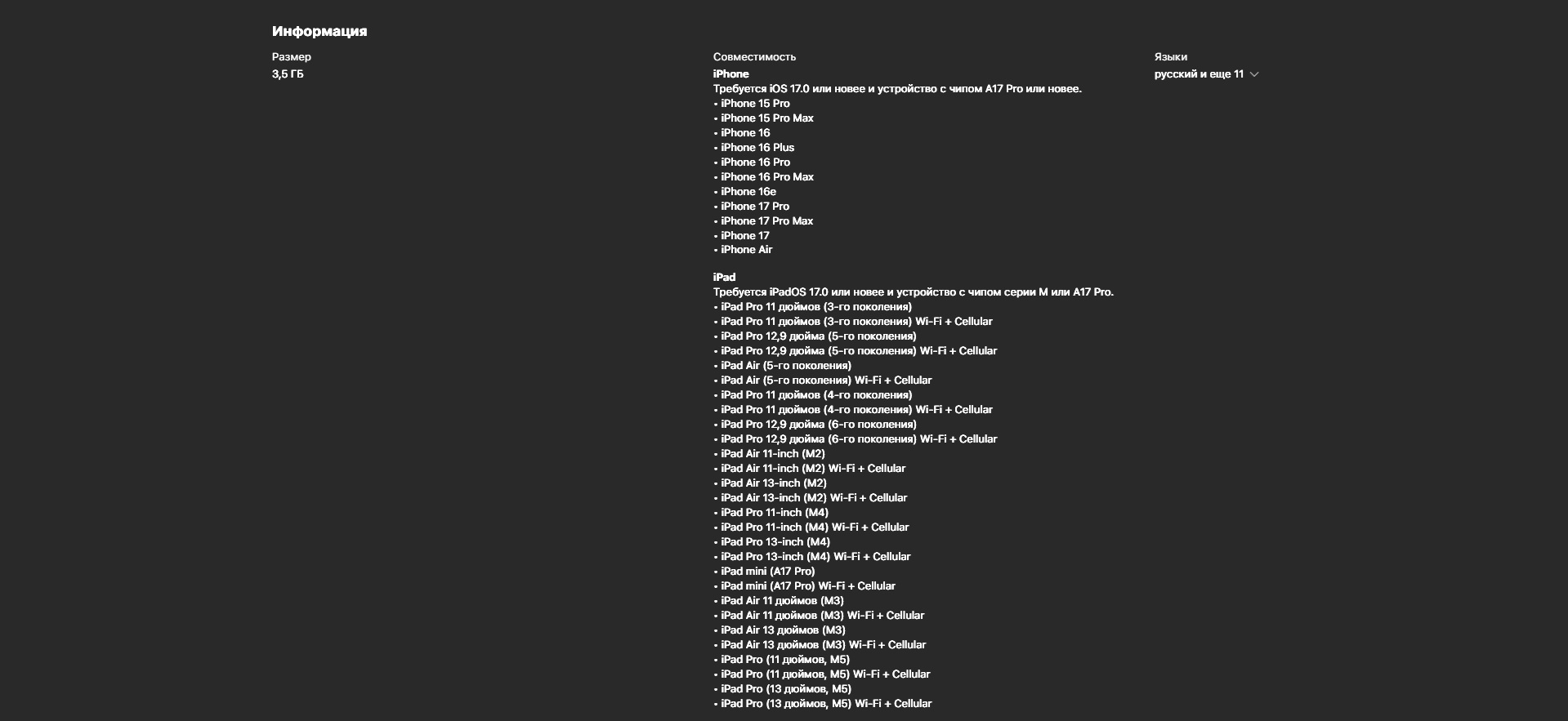 Доступна игра на iPhone и iPad с процессорами A17 Pro/M1 и выше. Для установки потребуется минимум 3,5 ГБ на накопителе.