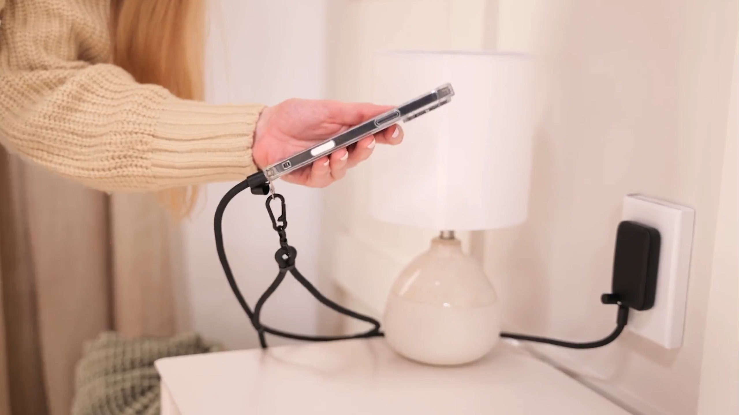 Кабель OntheGo объединяет оба аксессуара в одном, даже модный «носок» от Apple покупать не придется. Это одновременно и зарядный провод, и шнур через плечо для переноски смартфона.
