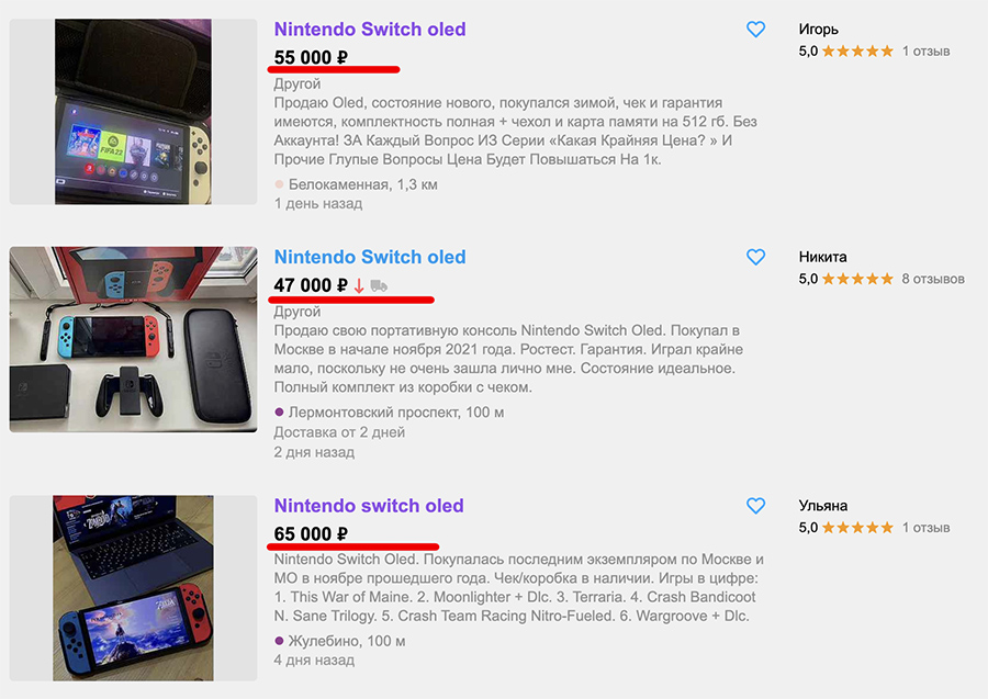 Так что я выставил на продажу свою Nintendo Switch OLED: полный комплект, идеальное состояние, 11 игр в комплекте. Цену указал самую на мой взгляд неприличную, в 55 000 рублей.
