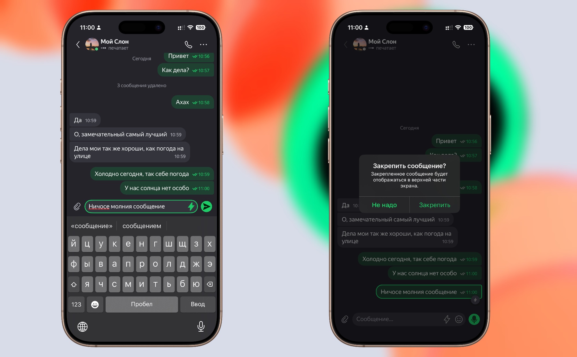 ◊ Отправка «важных» сообщений. В окне набора есть кнопка с молнией: такие сообщения всегда приходят уведомлением, даже если у собеседника выключены пуши для этого чата. Для рабочих или срочных вопросов прям маст-хэв.
