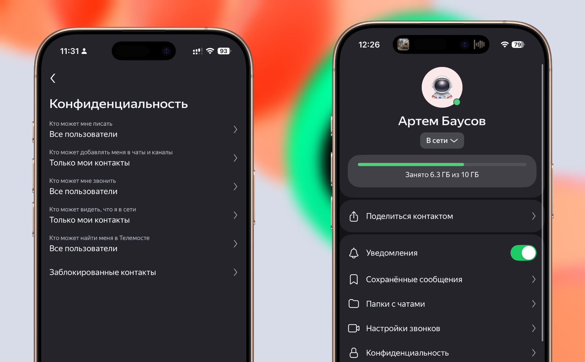 Есть также настройки конфиденциальности. Там можно настроить, кто вам может писать, добавлять в чаты и каналы, звонить и видеть ваш онлайн. Плюс также можно скрыть себя от поиска в Телемосте для всех.
