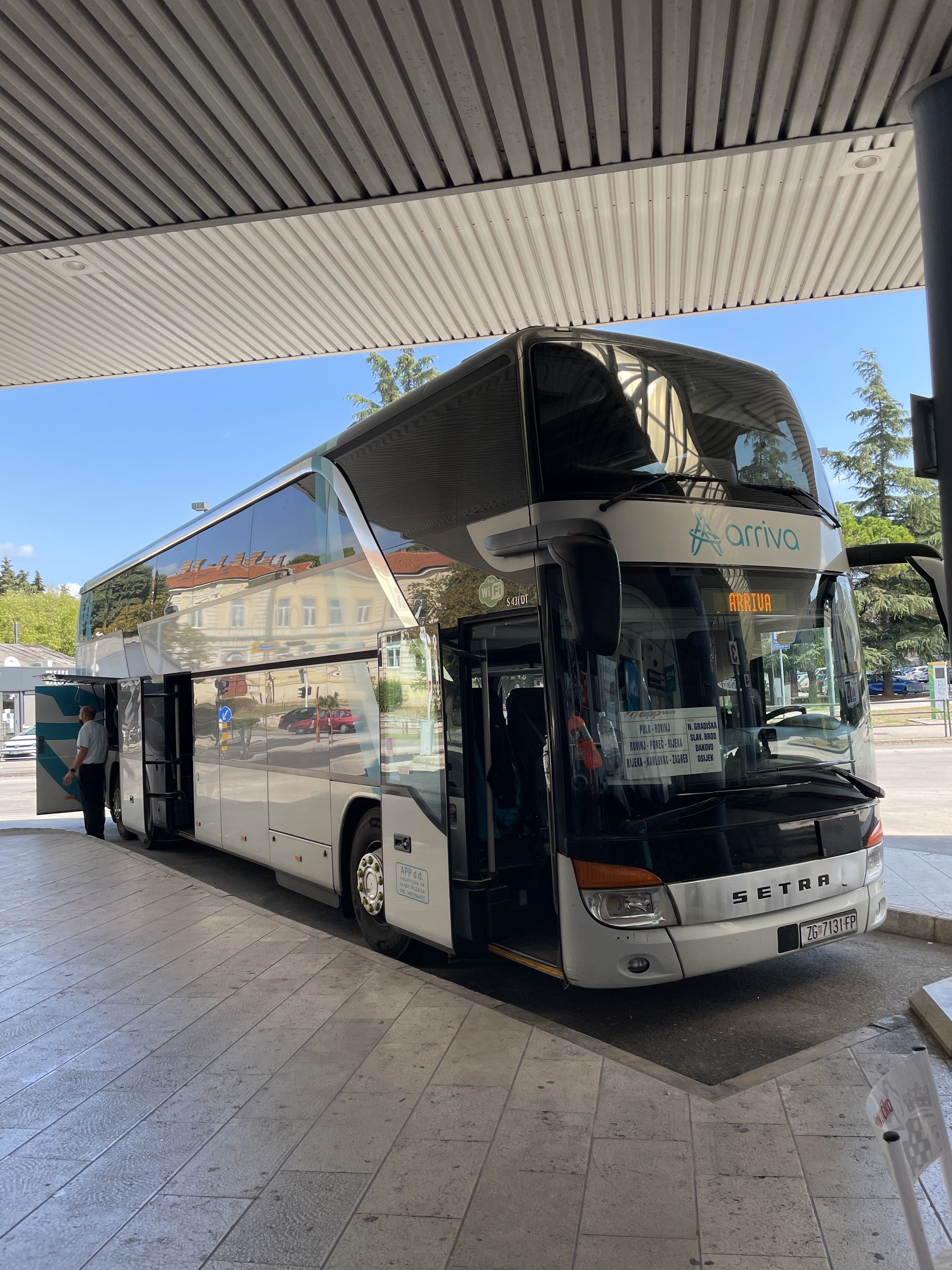 Двухэтажный автобус. Едет из Пулы в Ровинь, путь занимает 1 час.