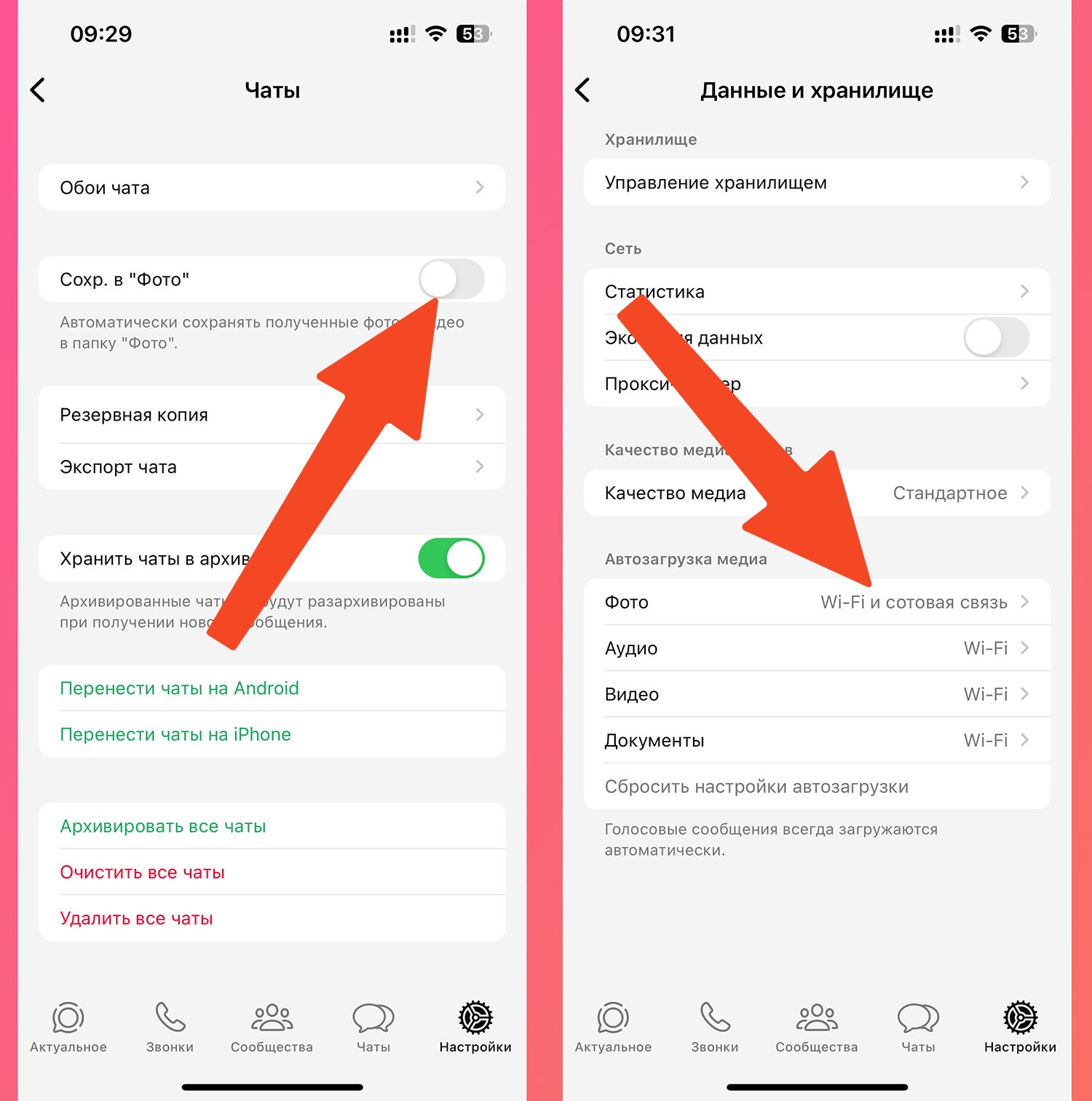 1. Отключите автоматическое сохранение фото и видео в галерею. Если это не сделать, все просмотренные медиафайлы будут сохраняться в приложение Фото. Перейдите в Настройки – Чаты и отключите тумблер Сохр. в “Фото”.