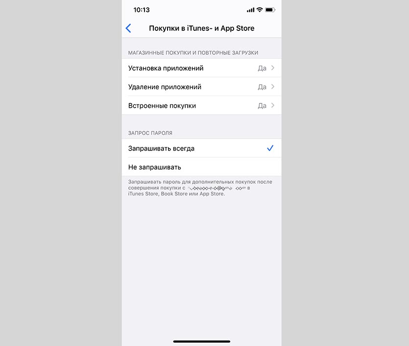 После этого перейдите в раздел Контент и конфиденциальность – Покупки в iTunes- и App Store. Здесь можно запретить установку приложений, совершение встроенных покупок или активировать запрос пароля при каждом приобретении в App Store.