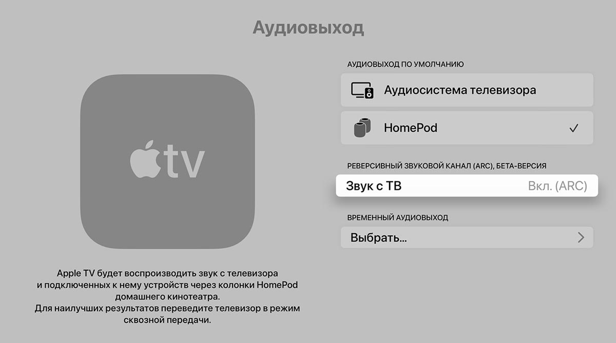 При наличии подобной спецификации в параметрах телевизора вы можете настроить вывод звука с него на приставку, а далее уже на колонку HomePod. Для этого подойдет только последняя модель Apple TV 4K (2021).