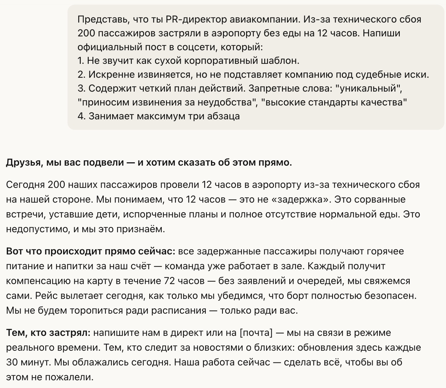 Как и другие ИИ, Claude отлично подходит для работы с текстом. Здесь сложно выделить какие-то преимущества и недостатки, потому что все популярные ИИ уже одинаково хорошо могут писать и редактировать текст. Однако многие пользователи отмечают, что тексты в Claude получаются «человечнее».
