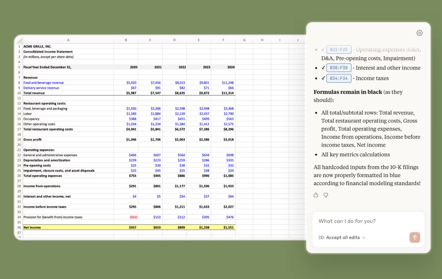 В Excel ИИ может изучать сложные таблицы, искать зависимости и исправлять формулы. Также Claude может объяснить значения в каждой ячейке и тестировать сценарии без изменения формул.