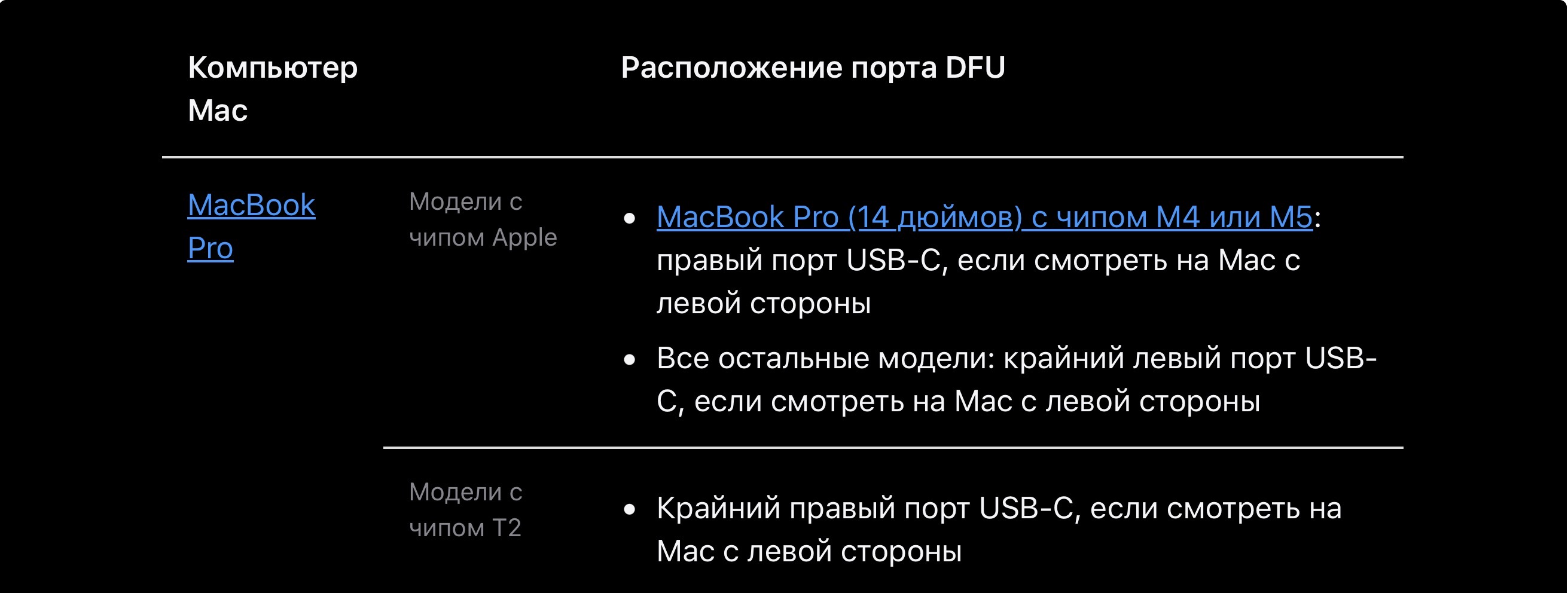 Фактическое расположение DFU-порта не совпадает с описанием на сайте Apple. Для корректного обновления системы требуется другой совместимый порт: если указан левый, то нужен правый, и наоборот. [LCS]