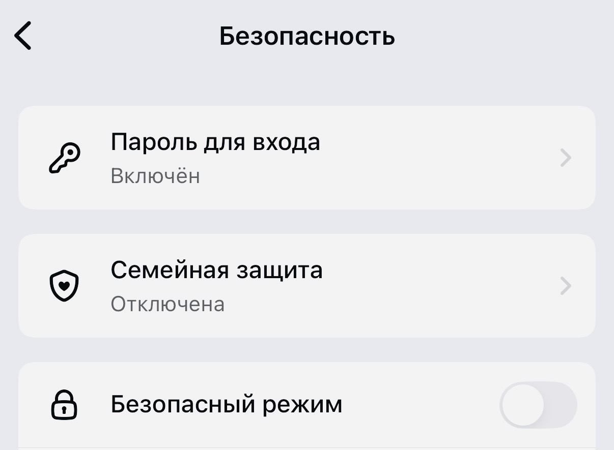 В настройках профиля доступны инструменты защиты: двухфакторная аутентификация, Безопасный режим и Семейная защита. Они находятся в разделе Безопасность.